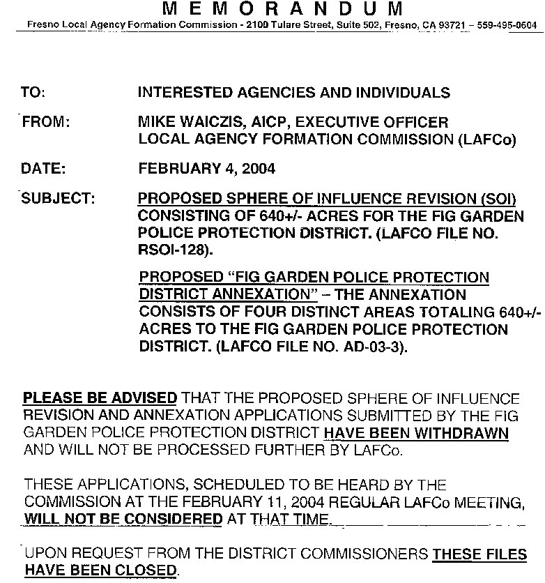 This is a copy of the notice. You can call LAFCo 495-0604 and verify the information. The Fig Garden Police Protection District will resubmit the application in the future. See notice sent out by the Homeowners association.